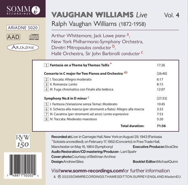 | Beschreibung: | SOMM RECORDINGS continues it's acclaimed Vaughan Williams Live series celebrating the 150th anniversary of Ralph Vaughan Williams' birth with Volume 4 featuring his signature Fantasia on a Theme of Thomas Tallis, the Concerto for Two Pianos and Eighth Symphony in recordings conducted by Dimitri Mitropoulos and Sir John Barbirolli. The Tallis Fantasia is a live recording from Carnegie Hall in 1943 with Mitropoulos, a committed advocate for Vaughan Williams' music, conducting the New York Philharmonic-Symphony Orchestra. They are also heard in the Concerto for Two Pianos, again from Carnegie Hall in 1952, when the soloists were Arthur Whittemore and Jack Lowe, who forged a widely popular and critically acclaimed piano duo partnership in America in the middle of the last century. Recorded in Manchester's Free Trade Hall in 1964, the Symphony No.8 is blazingly conducted by it's dedicatee, Sir John Barbirolli, leading the Hallé Orchestra., Runningtime: 00:00:00, Labelcode ARIADNE5020 |