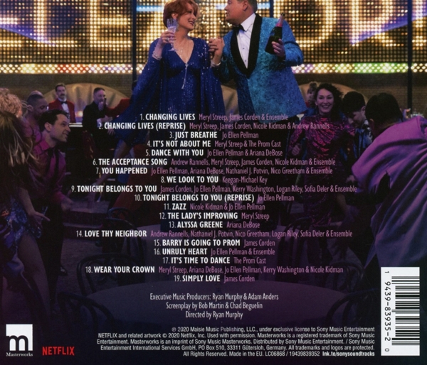 01. Streep, Meryl / Corden, James / The Prom Ensemble "Changing Lives" 02. Streep, Meryl / Corden, James / Kidman, Nicole / Rannells, Andrew "Changing Lives - Reprise" 03. Pellman, Jo Ellen "Just Breathe" 04. Streep, Meryl / Corden, James / Kidman, Nicole / Rannells, Andrew / Chamberlin, Kevin / Key, Keegan-Michael / Pellman, J "It's Not About Me" 05. Pellman, Jo Ellen / DeBose, Ariana "Dance with You" 06. Rannells, Andrew / Streep, Meryl / Corden, James / Kidman, Nicole / The Prom Ensemble "The Acceptance Song" 07. Pellman, Jo Ellen / DeBose, Ariana / Potvin, Nathaniel J. / Greetham, Nico / The Prom Ensemble "You Happened" 08. Key, Keegan-Michael "We Look to You" 09. Cast of Netflix's Film The Prom, The / Pellman, Jo Ellen / Corden, James / Washington, Kerry / Riley, Logan / Deler, Sof "Tonight Belongs to You" 10. Pellman, Jo Ellen "Tonight Belongs to You - Reprise" 11. Kidman, Nicole / Pellman, Jo Ellen "Zazz" 12. Streep, Meryl "The Lady's Improving" 13. DeBose, Ariana "Alyssa Greene" 14. Rannells, Andrew / Potvin, Nathaniel J. / Greetham, Nico / Riley, Logan / Deler, Sofia / The Prom Ensemble "Love Thy Neighbor" 15. Corden, James "Barry is Going to Prom" 16. Pellman, Jo Ellen / The Prom Ensemble "Unruly Heart" 17. Pellman, Jo Ellen / DeBose, Ariana / Streep, Meryl / Corden, James / Rannells, Andrew / Kidman, Nicole / Chamberlin, Kev "It's Time to Dance" 18. Streep, Meryl / DeBose, Ariana / Pellman, Jo Ellen / Washington, Kerry / Kidman, Nicole "Wear Your Crown" 19. Corden, James "Simply Love"