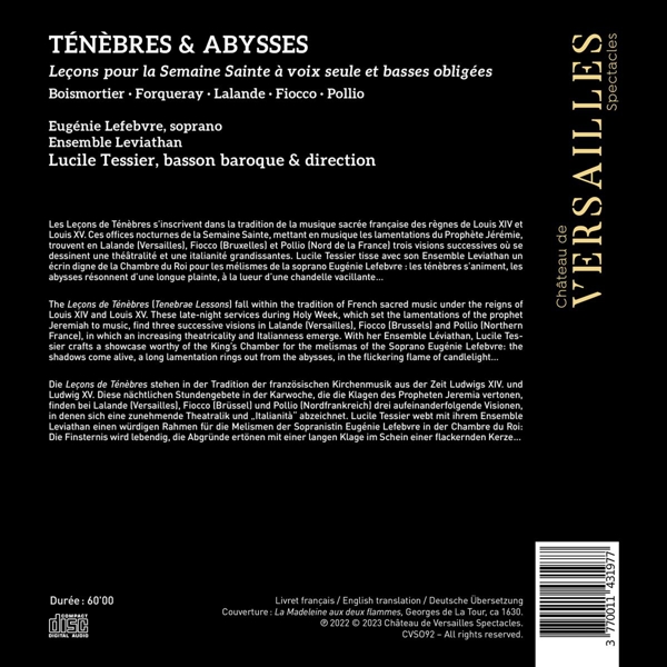 | Beschreibung: | The Leçons de Ténèbres (Tenebrae Lessons) fall within the tradition of French sacred music under the reigns of Louis XIV and Louis XV. These late-night services during Holy Week, which set the lamentations of the prophet Jeremiah to music, find three successive visions in Lalande (Versailles), Fiocco (Brussels) and Pollio (Northern France), in which an increasing theatricality and Italianness emerge. With her Ensemble Léviathan, Lucile Tessier crafts a showcase worthy of the King's Chamber for the melismas of the Soprano Eugénie Lefebvre: the shadows come alive, a long lamentation rings out from the abysses, in the flickering flame of candlelight, Runningtime: 00:00:00, Bassoon [Basson Baroque], Directed By: Lucile Tessier, Ensemble: Ensemble Leviathan, Recorded By, Engineer, Producer, Edited By: Arthur Delzescaux, Soprano Vocals: Eugénie Lefebvre, Composed By: Joseph Hector Fiocco, Composed By: Antoine Forqueray, Composed By: Jean-Baptiste Antoine Forqueray, Composed By: Pierre-Louis Pollio, Composed By: Joseph Bodin de Boismortier, Composed By: Joseph Michel, Composed By: Michel Richard Delalande, Labelcode CHAV92.2 (CVS092), Phonographic Copyright (p) Château de Versailles Spectacles, Copyright (c) Château de Versailles Spectacles, Recorded At Petit Trianon, Versailles, Made By Sonopress |