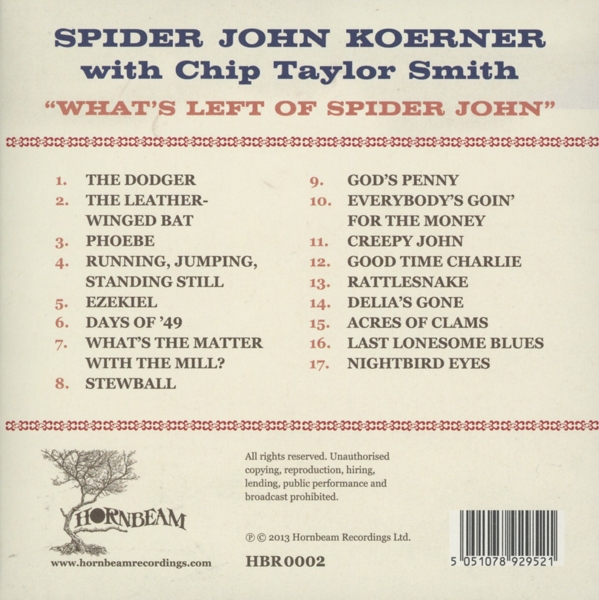 01. "The dodger" 02. "The leather-winged bat" 03. "Phoebe" 04. "Running, jumping, standing still" 05. "Ezekiel" 06. "Days of '49" 07. "What's the matter with the mill?" 08. "Stewball" 09. "God's penny" 10. "Everybody's goin' for the money" 11. "Creepy John" 12. "Good time Charlie" 13. "Rattlesnake" 14. "Delia's gone" 15. "Acres of clams" 16. "Last lonesome blues" 17. "Nightbird eyes"