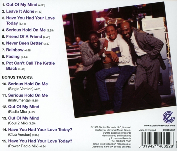 01. "Out of my mind" 02. "Leave it alone" 03. "Have You Had Your Love Today?" 04. "Serious hold on me" 05. "Friend of a friend" 06. "Never been better" 07. "Rainbow" 08. "Fading" 09. "Pot can't call the kettle black" 10. "Serious hold on me (Single Version) (Bonus Track)" 11. "Serious hold on me (Instrumental) (Bonus Track)" 12. "Out of my mind (Radio Mix) (Bonus Track)" 13. "Out of my mind (Soul 2 Mix) (Bonus Track)" 14. "Have you had your love today? (Club Version) (Bonus Track)" 15. "Have you had your love today? (Power Radio Mix) (Bonus Track)"